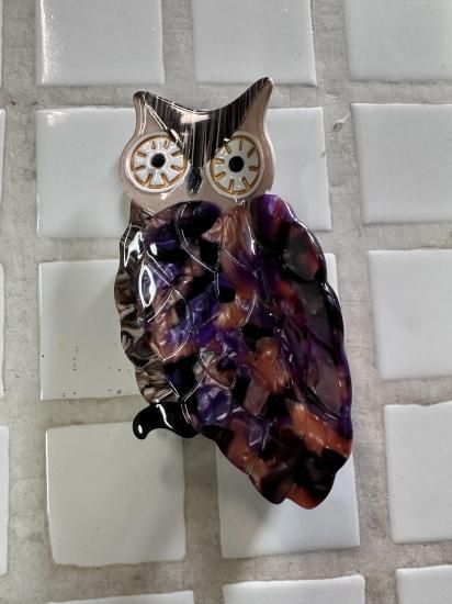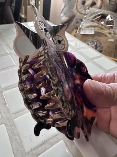 ヘアクリップ フクロウは、お洒落なパープルモザイクが髪に映えるフクロウモチーフが特徴的なヘアクリップです。大ぶりでしっかりとしたはさみ具合で、髪型を引き立てるアクセサリーとして最適です。幸せを象徴するフクロウを髪に留めることで、日々の装いに一味違った個性と幸運をプラスしてくれます。
